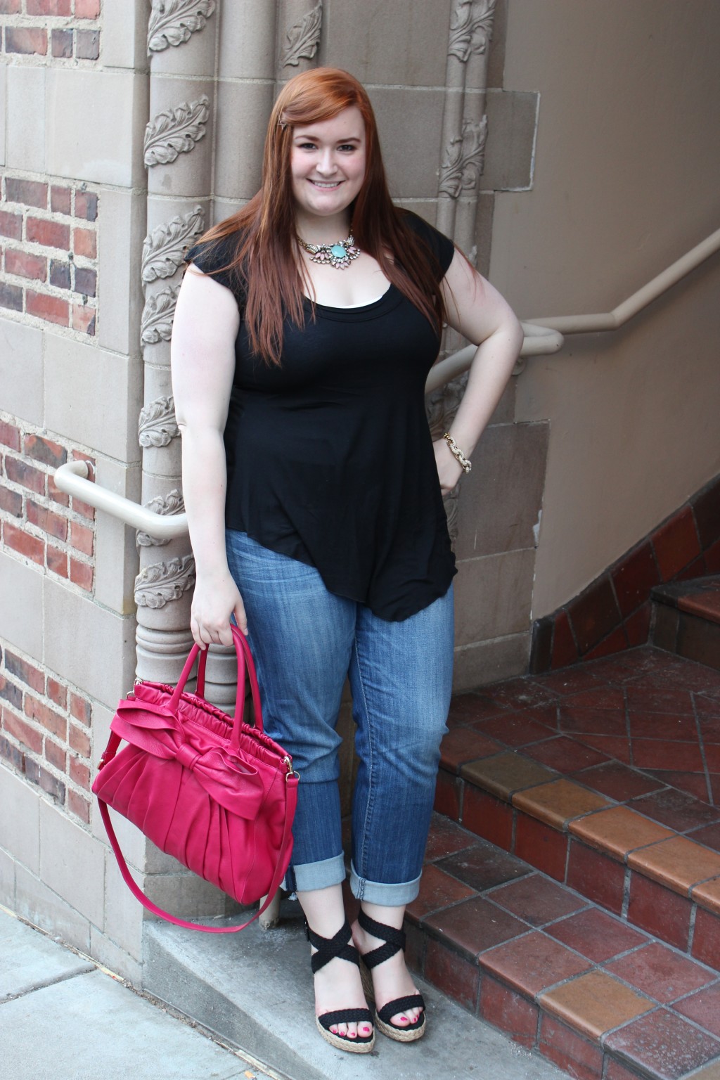 Shirt: H&M; Jeans: [shopsense shopsense_url=”http://api.shopstyle.com/action/apiVisitRetailer?url=http%3A%2F%2Fshop.nordstrom.com%2Fs%2Fkut-from-the-kloth-catherine-slim-boyfriend-jeans%2F3445626%3Forigin%3DPredictiveSearch-personalizedsort” original_url=”http://shop.nordstrom.com/s/kut-from-the-kloth-catherine-slim-boyfriend-jeans/3445626?origin=PredictiveSearch-personalizedsort&contextualcategoryid=2375500&fashionColor=&resultback=2046&cm_sp=personalizedsort-_-searchresults-_-1_6_A” save_to_store=”true”]KUT from the Kloth[/shopsense]; Necklace: J. Crew; Bracelet: J. Crew; Bag: RED Valentino (similar [shopsense shopsense_url=”http://api.shopstyle.com/action/apiVisitRetailer?url=http%3A%2F%2Fshop.nordstrom.com%2FS%2Fred-valentino-bow-large-leather-crossbody-bag%2F3381168%3Forigin%3Dcategory-personalizedsort” original_url=”http://shop.nordstrom.com/S/red-valentino-bow-large-leather-crossbody-bag/3381168?origin=category-personalizedsort&contextualcategoryid=0&fashionColor=&resultback=1714&cm_sp=personalizedsort-_-browseresults-_-1_5_A” save_to_store=”true”]here[/shopsense]); Shoes: Stuart Weitzman (similar [shopsense shopsense_url=”http://api.shopstyle.com/action/apiVisitRetailer?url=http%3A%2F%2Fshop.nordstrom.com%2FS%2Fstuart-weitzman-metalmania-wedge-sandal%2F3422467%3Forigin%3DPredictiveSearch-personalizedsort” original_url=”http://shop.nordstrom.com/S/stuart-weitzman-metalmania-wedge-sandal/3422467?origin=PredictiveSearch-personalizedsort&contextualcategoryid=6024190&fashionColor=&resultback=1198&cm_sp=personalizedsort-_-searchresults-_-1_4_C” save_to_store=”true”]here[/shopsense])