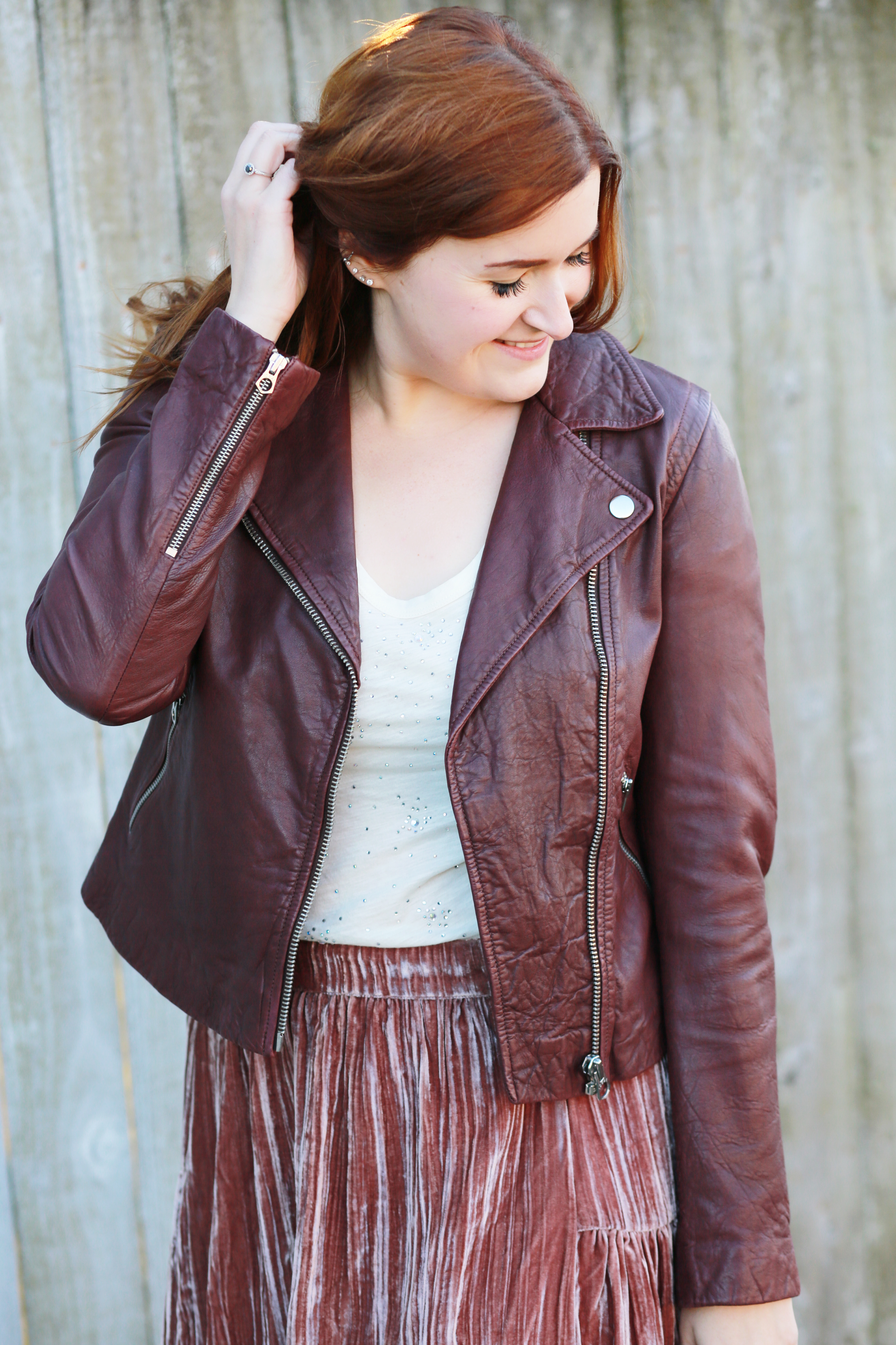 A bold jacket paired with a textured skirt and bold pair of sneakers can be a fun way to dress up yet feel like a badass at the same time. Here I’m restyling my embellished leather jacket with a pleated velvet skirt and a new pair of sneakers with glittery stars.